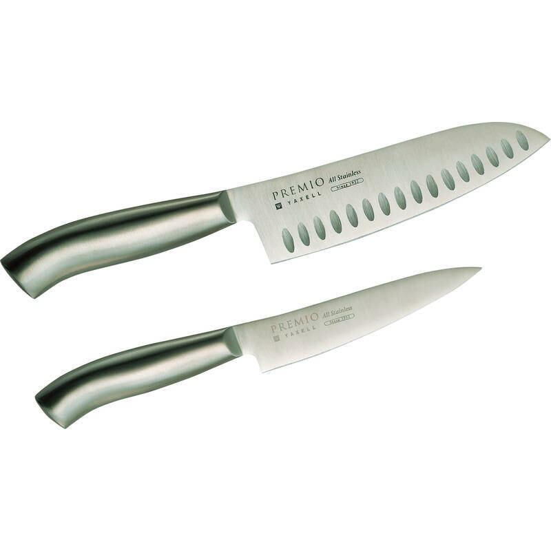 継ぎ目のないオールステンレス包丁2本セット。三徳には切離れのいいディンプル付です。ハンドルは持ちやすさを追求した独特のカーブハンドル。