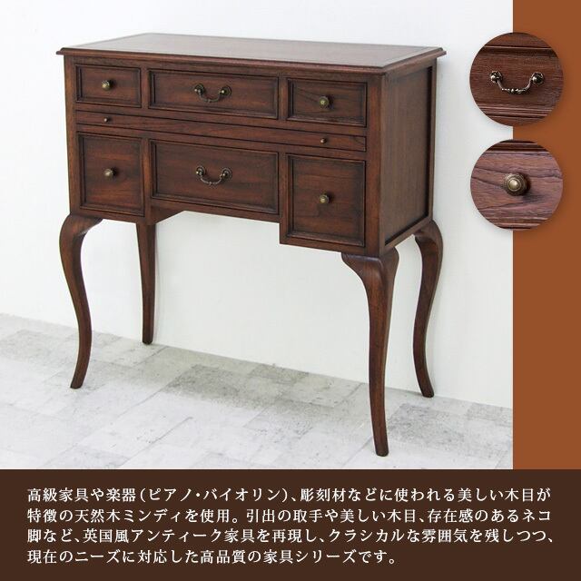 ◆引出の取手や美しい木目、存在感のあるネコ脚など、英国風アンティーク家具を再現しております。